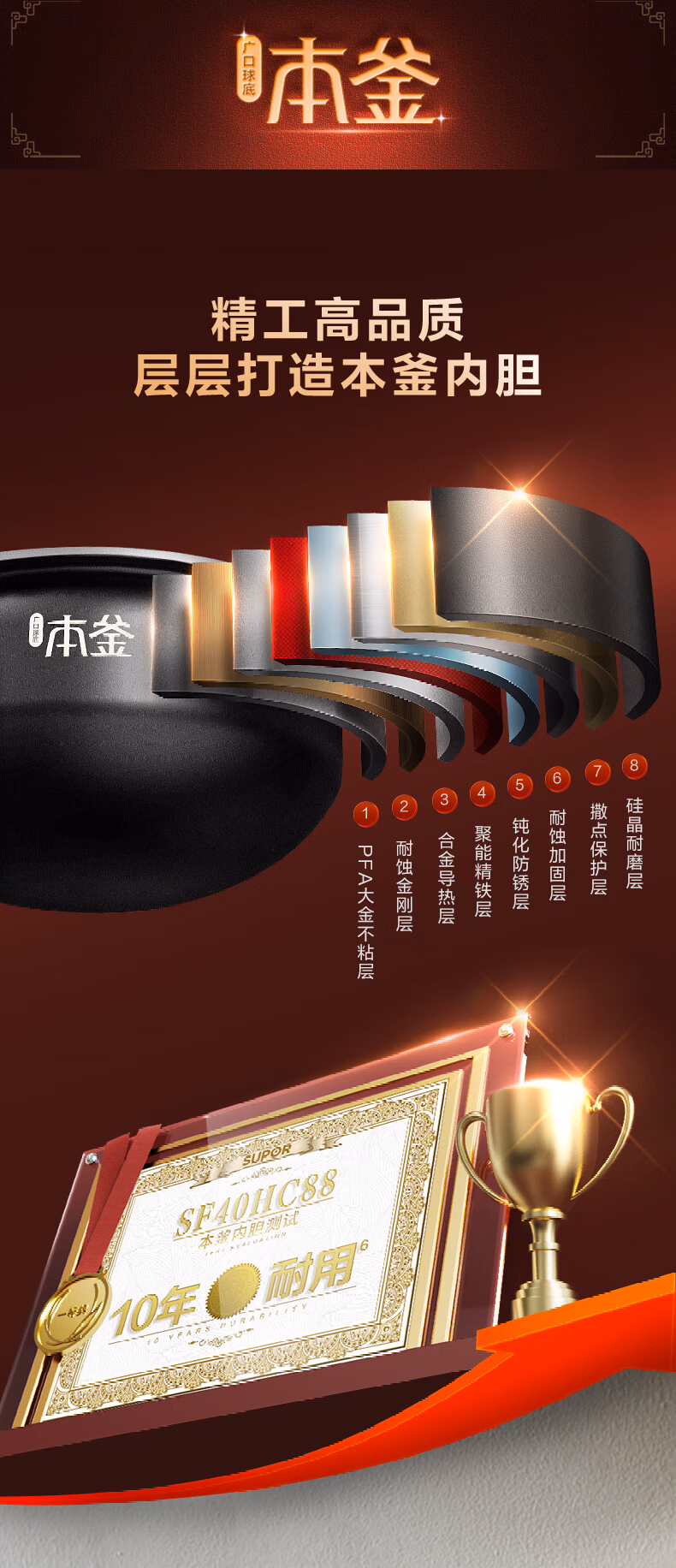 苏泊尔(SUPOR)远红外0涂层本釜电饭煲4升家用智能多功能煮饭锅 SF40HC0808