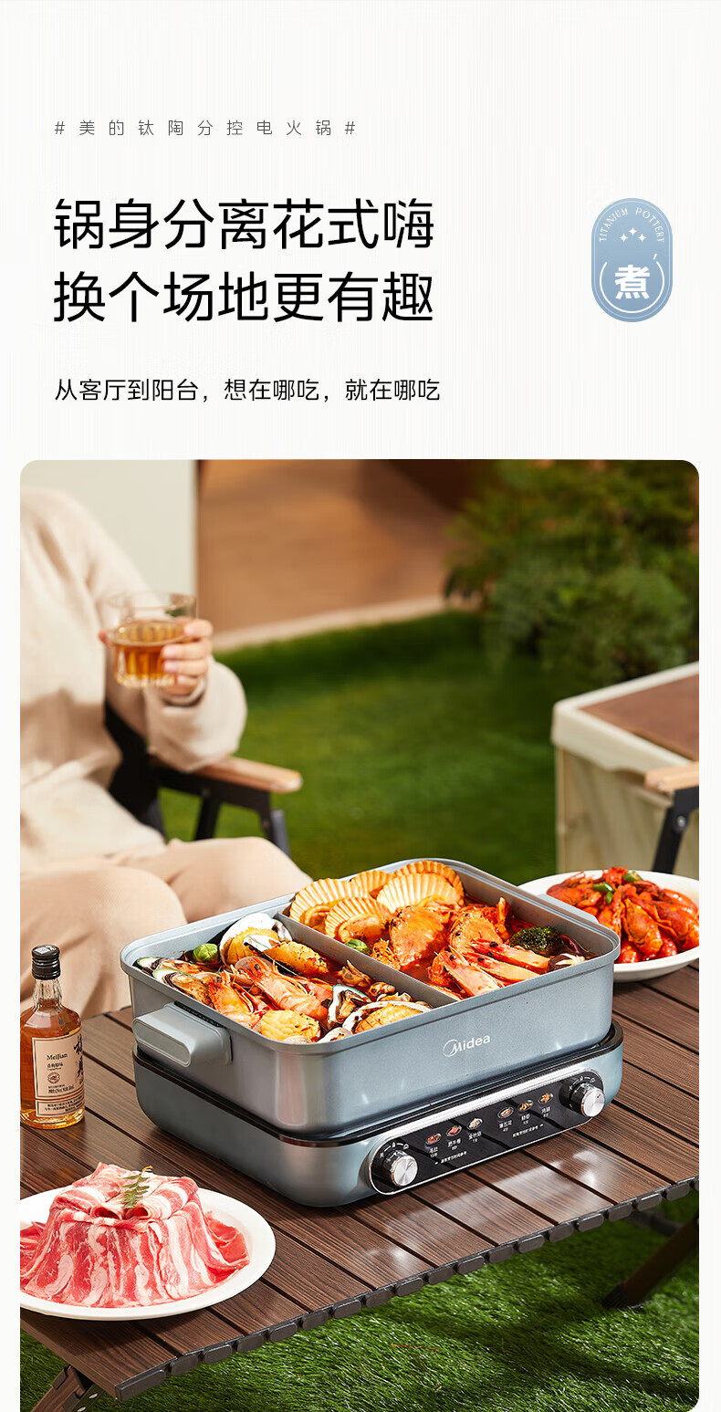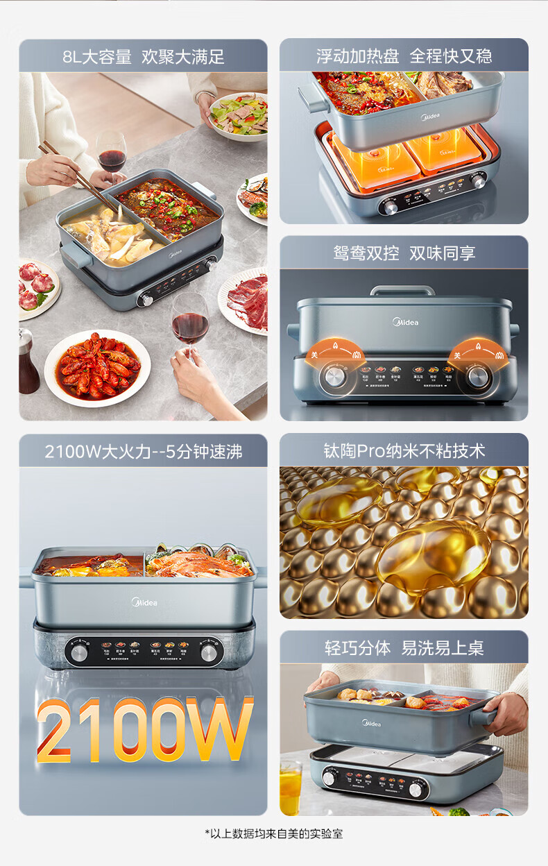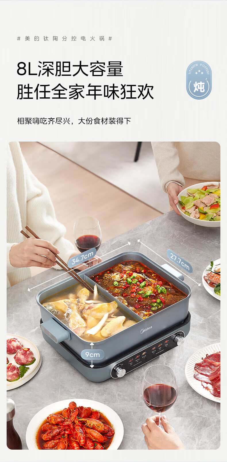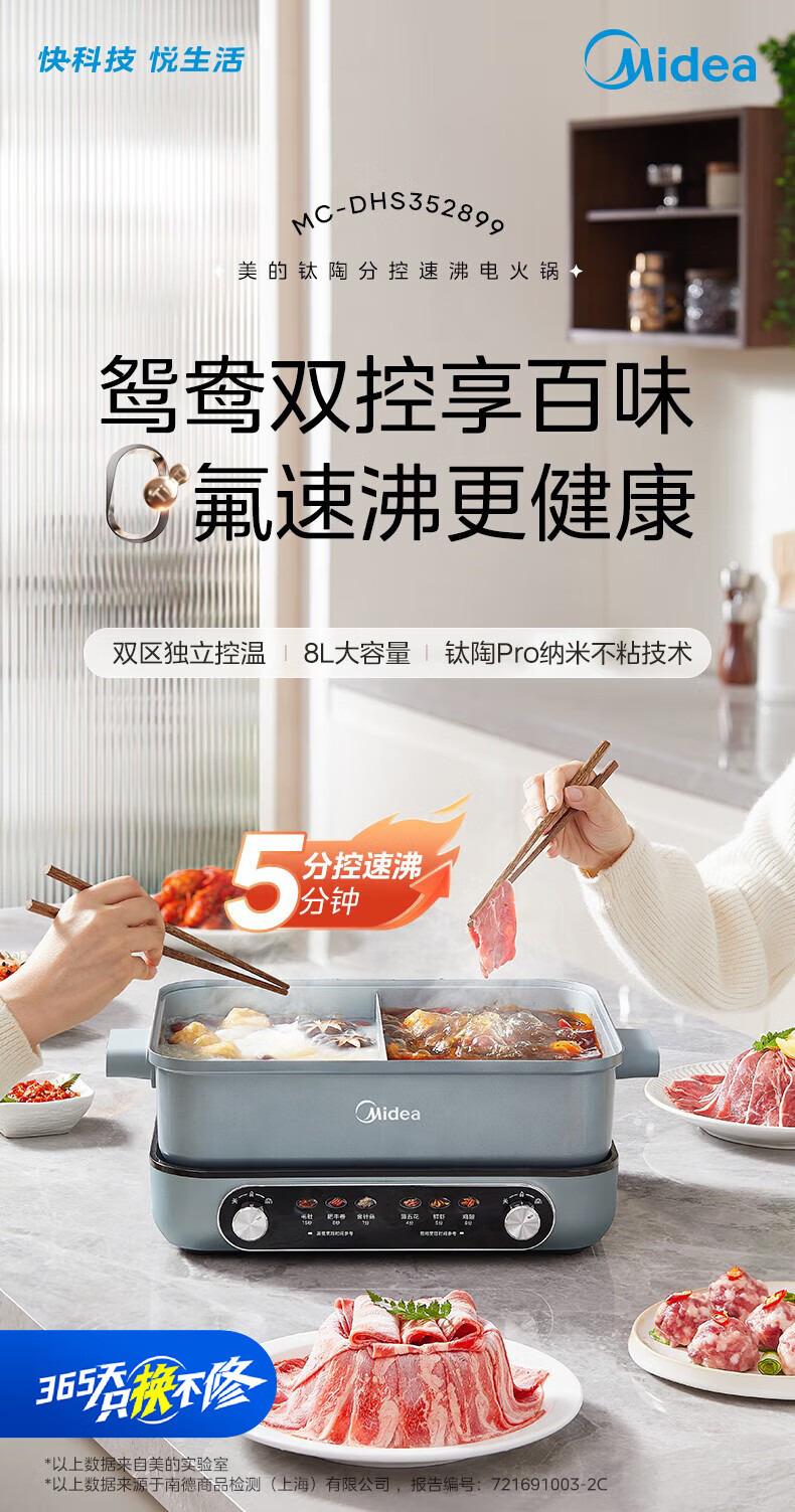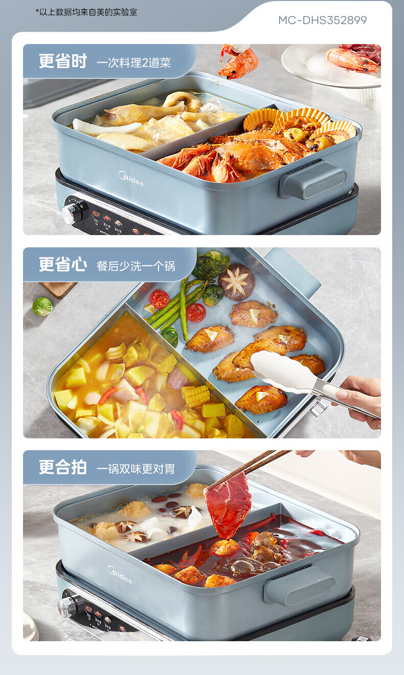 美的(Midea)电火锅 8L分体式速沸鸳鸯锅 钛陶PRO电煮锅 电热锅电炒锅DHS352899